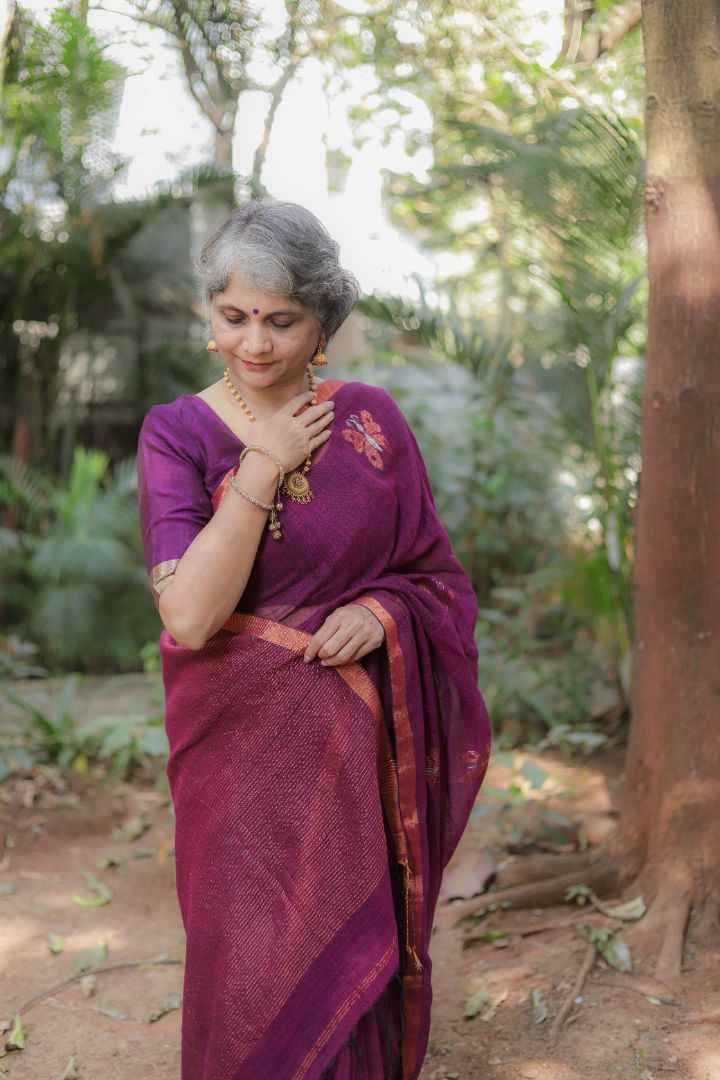 This is butterfly linen jamdani saree with copper zari border. It has very pretty pallu with copper strips on it. The saree has copper-coloured butterflies on it. This saree balances artistry and elegance—subtle enough for office wear, yet distinctive enough for special daytime occasions. This saree is for women who love quiet details and enduring style.