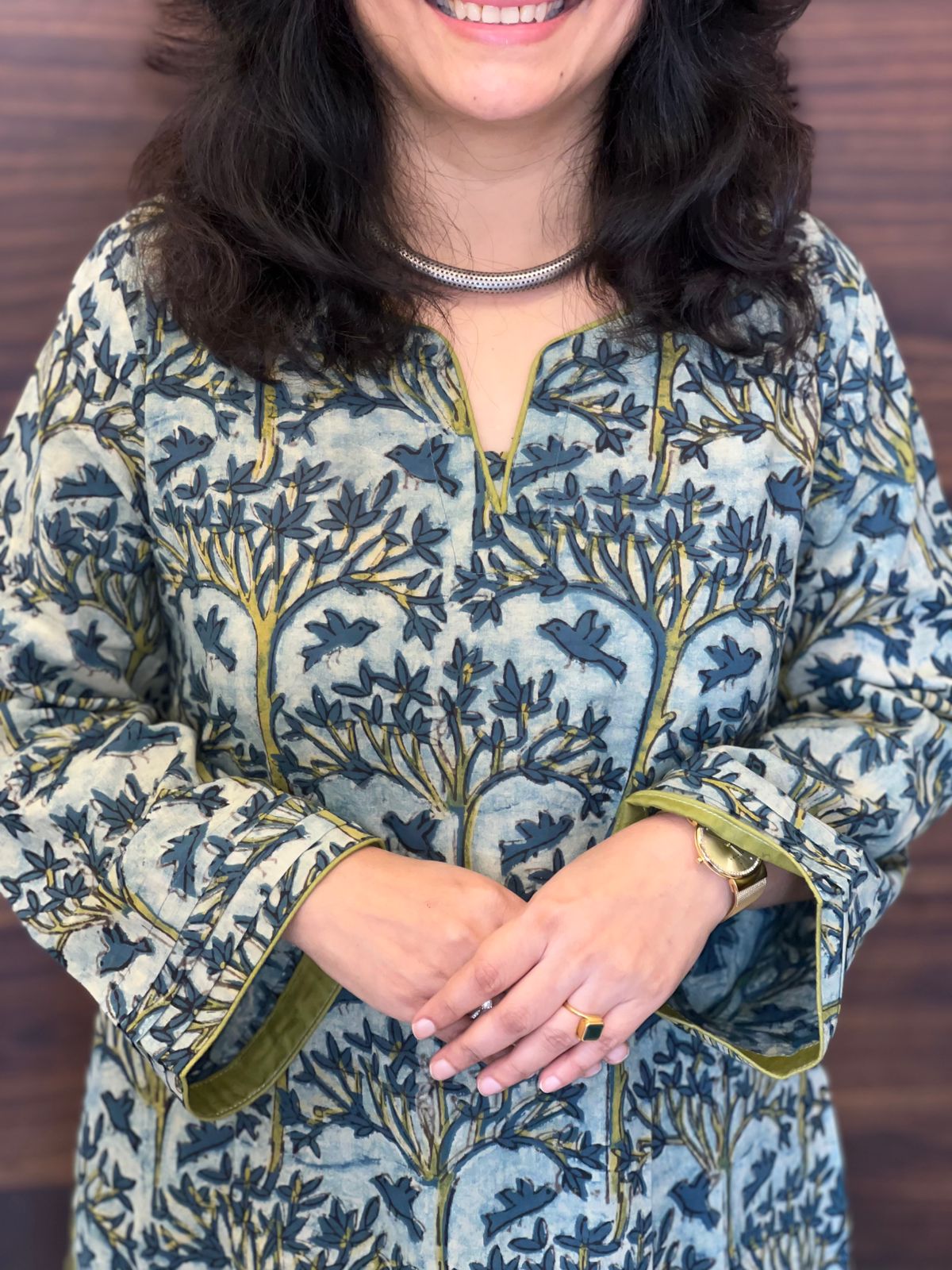 Green Color Vanaspati Hand Block Print Pure Cotton A Line Kurti